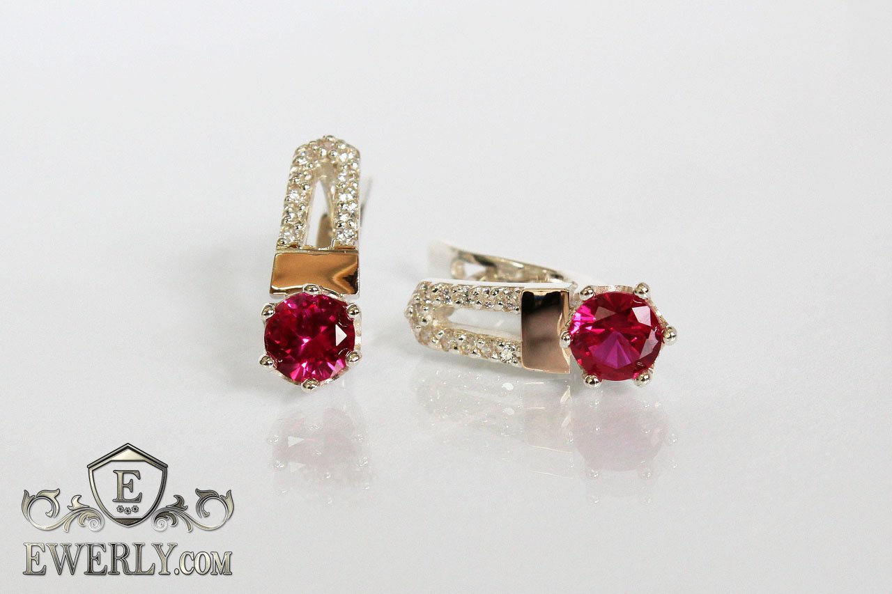 Серьги из серебра 925 пробы с золотыми пластинами 375 пробы с фианитами (рубиновый цвет) для женщин.