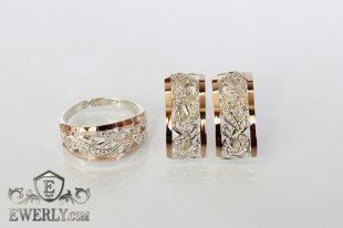 Комплект из женского кольца и серёжек из серебра 925 пробы с золотыми пластинами 375 пробы.